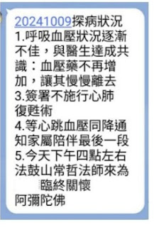 從10月4日到10月9日,我持續進行療癒。10月9日晚上,阿姨透過我媽媽告訴我姨丈的最新狀況(如附圖所示)。10月10日晚上,我停止了靈氣療癒。隔天(10月11日)早上7點多,姨丈安詳辭世,圓滿走完了一生。我心想,這次的靈氣療癒加上天使音叉療癒,或許也能作為一份祝福,幫助阿姨與姨丈能夠好好道別。